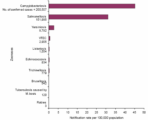 Statistically, hard data is difficult to find. The few cases of zoonotic transmissions from pet dogs to humans that are well documented occurred when people were careless with their own hygiene, and ingested dog feces off their own hands after carrying their pets. A chart is included here that shows frequency of zoonotic infections for 2007 in the European Union. It does not break out the frequency by species, but with the exception of three rabies cases, these are all diseases contracted by eating infected meat or processed vegetables. During that same year in the United States, 278 people were struck by lightning, 47 of who died. For those folks who practice normal daily hygiene rituals, and whose dogs are on a standard prescribed vaccination schedule, we are literally more likely to be struck by lightning than we are to catch a deadly disease from kissing a dog, or letting a dog lick us.