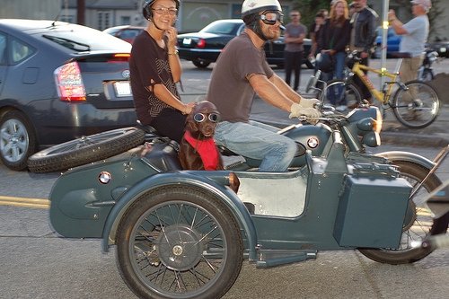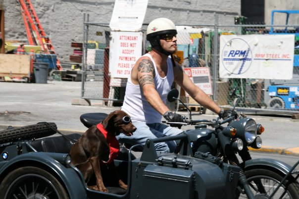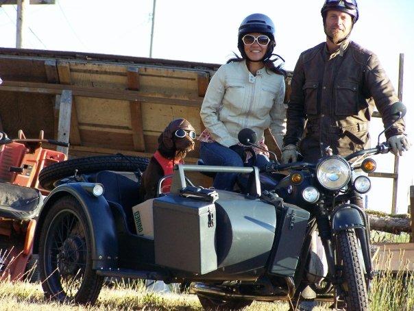 How did you train Strummer to ride with you? I started training her for the sidecar about a month before I picked it up. I started by putting my ski goggles on her and not allowing her to take them off. When I got the bike home I brought her out to the garage while I worked on it. When she was comfortable with the sound of the motor and vibration I turned the bike off and put her in the sidecar. I continued to work on the bike with the engine off making sure to jostle the rig as much as possible. Once I felt she was ready I fired the motor and she jumped out. I lead her back into the sidecar and continued doing other things and left the motor running. I then revved the motor and she jumped out again. I led her back into the sidecar and held her collar while I made her watch me operate the throttle then she figured it was me causing all the racket and chilled out.