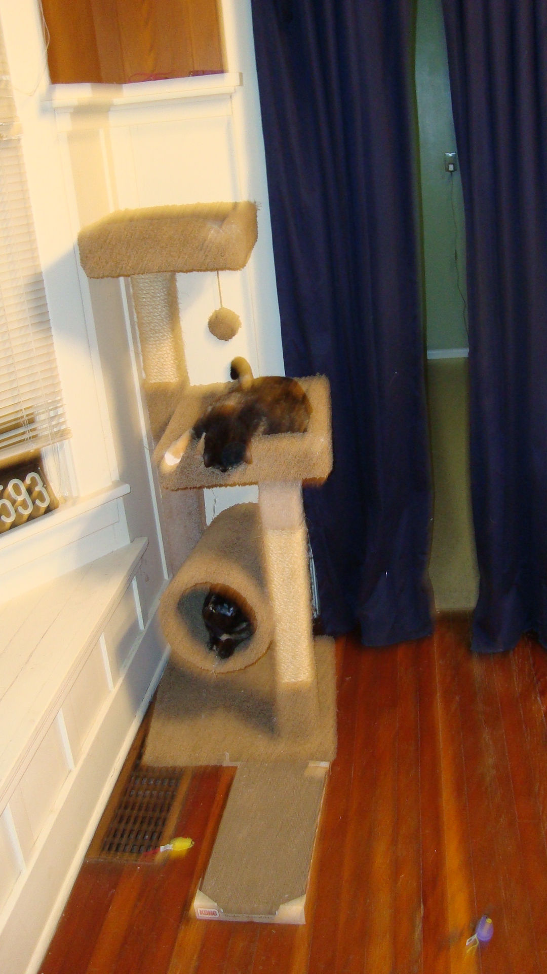 My wife and I adopted two female cats at the same time, Sweety-Pie and Lopsy. Though they looked alike, and got along well, they were not related, and were both female strays from different cities in western Washington.  They were both around four years old. On the drive home we changed their names to “Pie” and “Lorena”, and a few minutes after that, we started calling Lorena “Larry”. Pie was the bossier of the two, and instigator of wrestling matches and generally more of a trouble-maker.