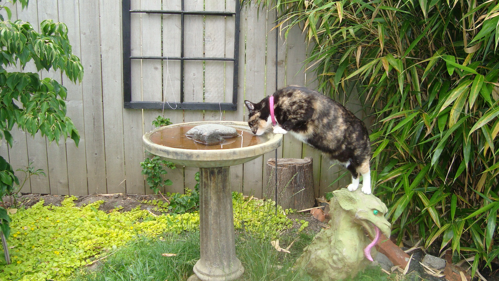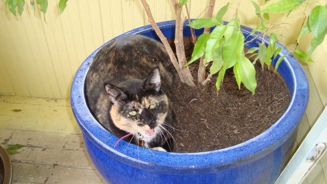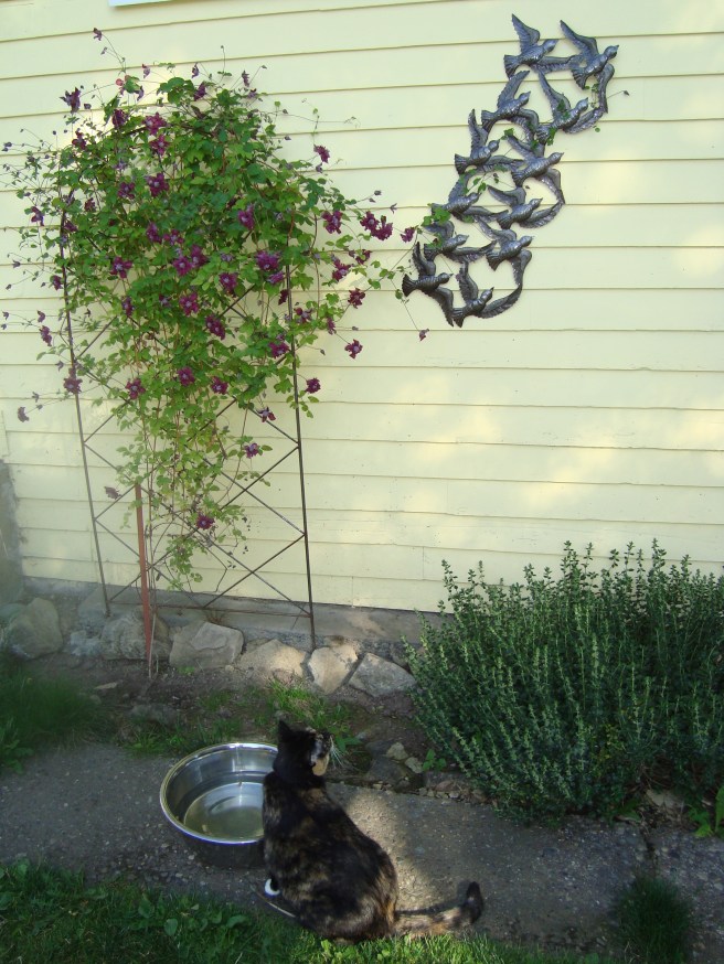 We have always kept our cats mostly indoors, though we allow them to explore the backyard, and if they hop the fence into our side yard, we do not panic. They always come around to the front to be let in, or hop back over the fence. They sleep inside, and never go out in the dark or in bad weather. Pie, however, would fling herself against the door and yowl if she didn’t get to go out once a day. Even right after using her litter box sometimes, she just had to go out and smell the rain, or whatever it is that cats do.