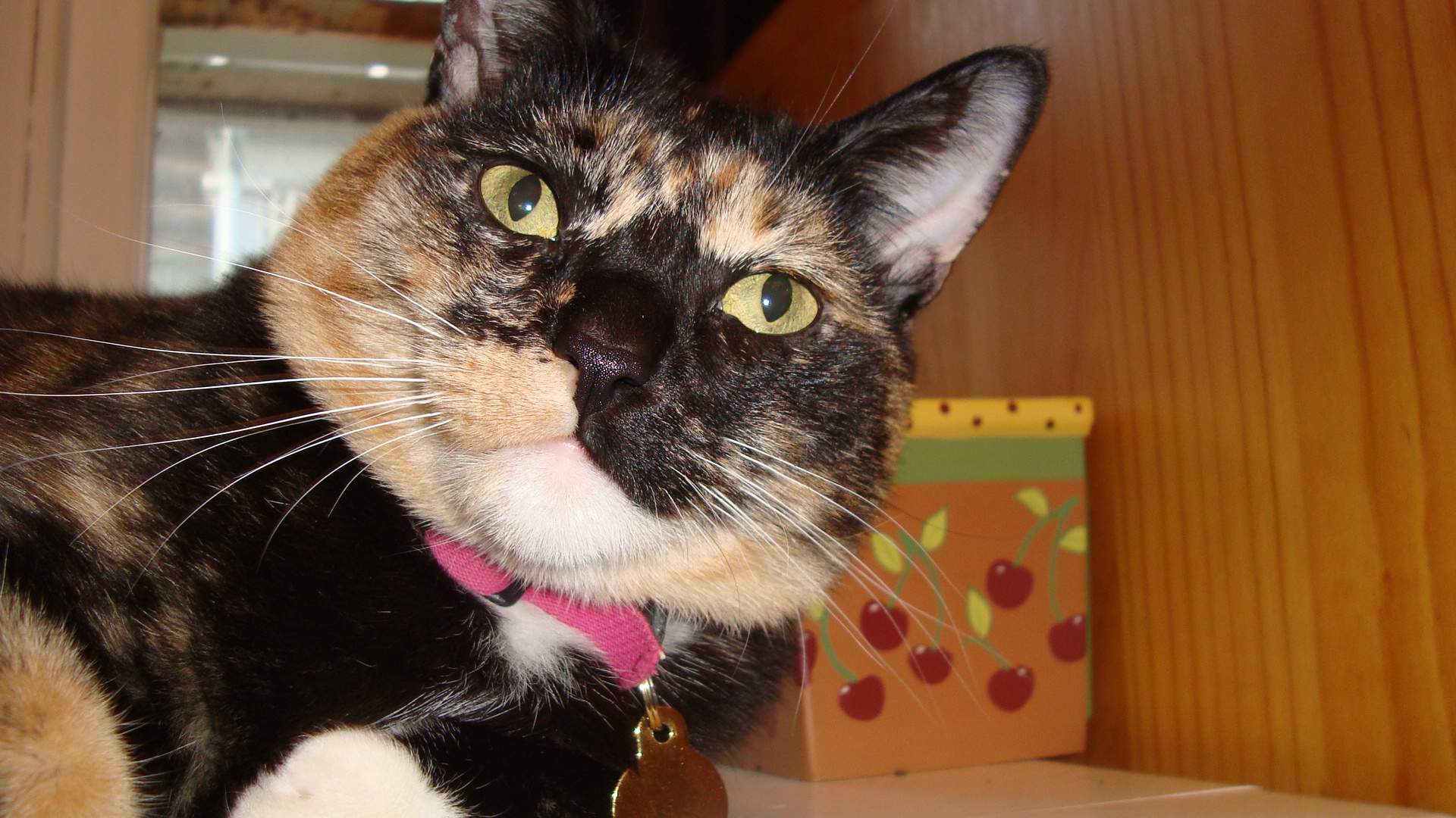 Pie was a very rare coloring called tortico: half tortoise-shell and half calico. Tortoise shell cats are known to be a little aloof, and Pie was that, but also affectionate in her own time, as calicos are known to be. I grew to be very fond of her rare but enthusiastic snuggle sessions. When I brought home Iggy, our bullmastiff, a few months later, Larry was a little scared at first, but Pie walked right up to him and bopped him in the noise. We would occasionally find a single little droplet of blood atop Iggy’s snout, and we knew that meant he had been investigating Pie a little too closely.  Her confidence fascinated me.