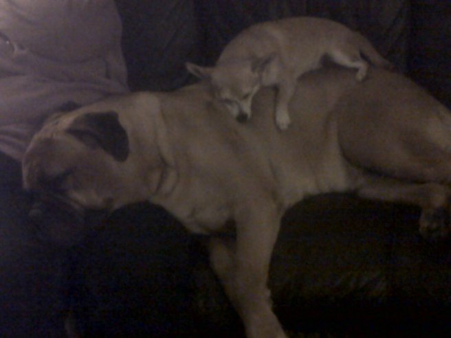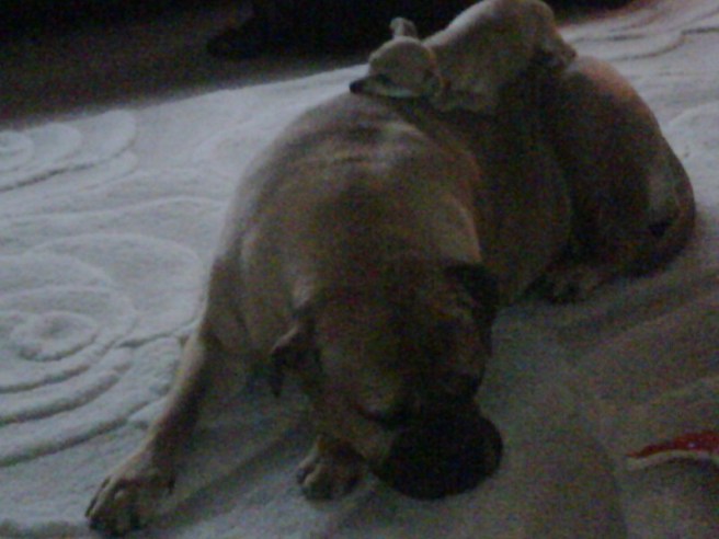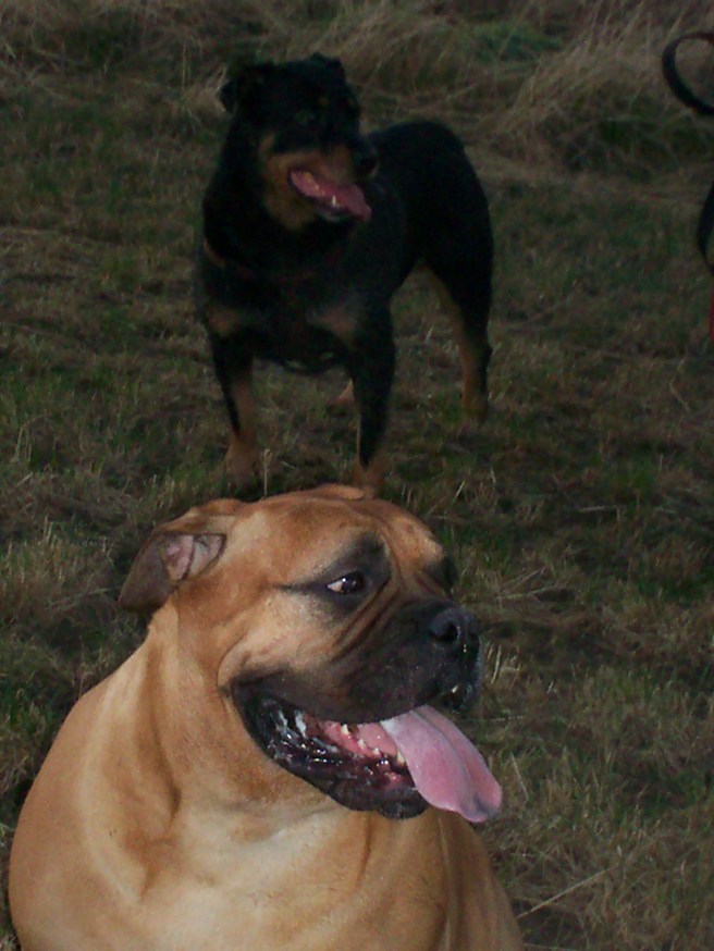 Amber, the Bullmastiff, is now 7 years-old, and Lola, the Chihuahua, is now 2-years old. They are still very much a tag team. They sleep together; Lola runs to Amber if she is in trouble. They still play all the time. When we put them into kennels, Lola spends most of time sitting or sleeping on Amber’s back, much to the amusement of anyone who sees it. It is amazing how gentle Amber is. She has a very mild temperament, and is a very loving dog. She loves people and other animals alike. All the dogs get on well together. Lola does think she rules to the pack, and Amber and Jade are happy to let her.