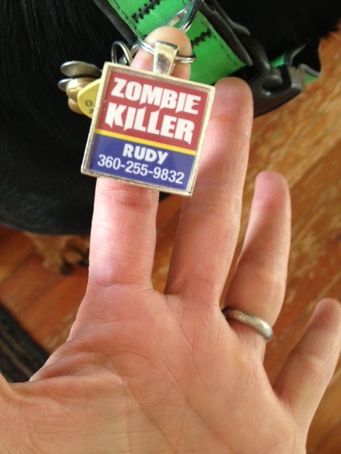 One of the most surprising things about Rudy is how completely and totally he believes in the television. I expected him to be a little weirded out by it (remember, he had never been inside a house before), but he actually sees the images as though they are in the room with us. At first, this caused many problems. The MGM lion at the beginning of a movie caused him to panic – he peed on the floor, ran through his own pee, and attacked the television. When I thought we had the television thing under good control, we tried to watch Walking Dead. A zombie came on the screen, and Rudy attacked the television with such enthusiasm, he put a 4-inch scratch right down the screen. Angi and Jason Lenz from Tails-A-Wagging gave him a “Zombie Killer” name tag to commemorate that incident.