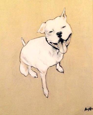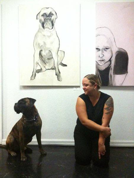 After Michelle finished the portrait, it was in our home for several months when she called and asked if she could include it in a show she was hanging. Of course I said yes, and asked if I could bring Iggy. I was pleasantly surprised when she said sure, and more surprised to find out that his portrait was hung front and center alongside her own self-portrait (see top). Iggy, as usual, was a gentleman throughout the opening. Watching Michelle with him that night helped me understand why she was able to create such a wonderful portrait. She had, and has, a way with animals that is very special. Instead of looking for the differences, she looks for the sameness-es. Instead of finding just the subject, she finds the emotional and the intellectual, the history and the potential. Whether Michelle is walking a dog, petting one, or painting one, she looks inside them and finds the very best of them. When we are very, very lucky, she shows it to us through her work.